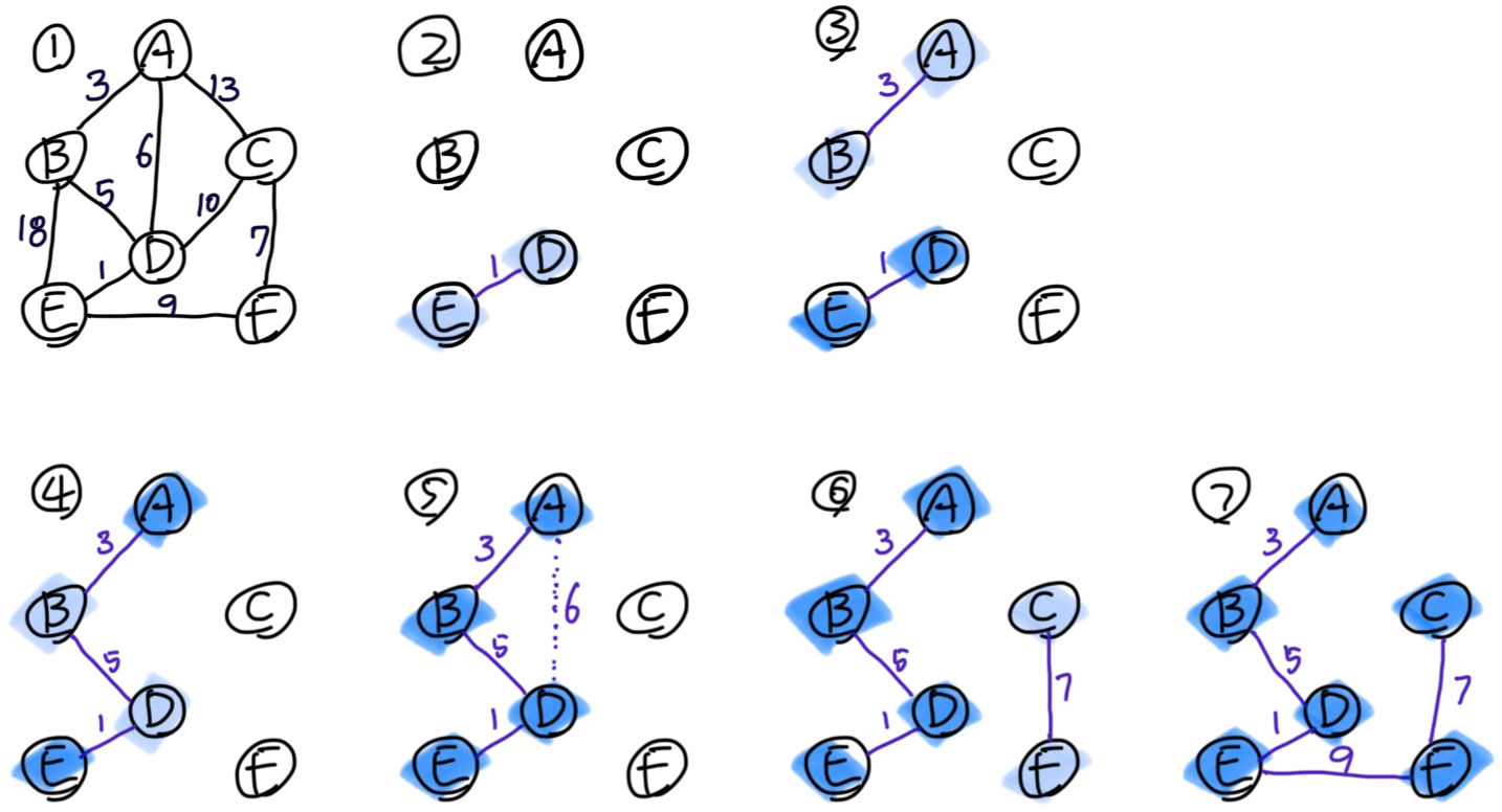 예에서 보듯 크루스칼 알고리즘은 정점을 기준으로 트리를 생성하는 프림 알고리즘과 달리 간선을 기준으로 트리를 생성한다. 즉, 흩어져 있는 여러 트리(노드)를 가중치가 작은 간선으로 연결해 하나의 최소 신장 트리를 생성한다.
