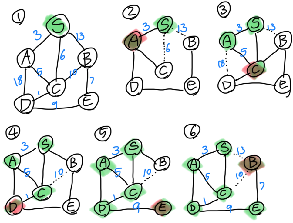 5. 정점 S, A, C, D에서 탐색 가능한 정점은 B와 E. 연결된 간선의 최소 가중치는 10과 9이다. 이 중에서 가장 작은 가중치는 9이며 연결된 정점인 E를 트리에 추가한다.
