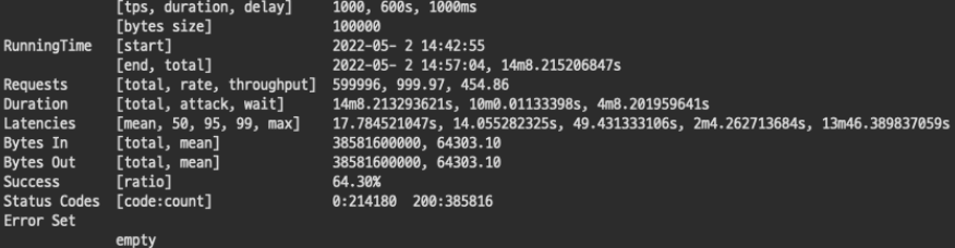 특히 이번에는 실제 데이터가 몰리는 상황을 연출하기 위해서 각 테스트 마다 600s(10분) 동안 요청 바디사이즈 100Kb, 응답 바디사이즈 100Kb 그리고 응답서버에서 딜레이되는 지연시간 1000ms(1초)를 설정하였다. 이정도 부하라면 실제 상황에서도 충분한 대용량 데이터 부하라고 생각하여 설정하게 되었다.
