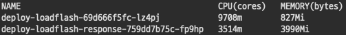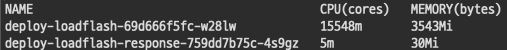 테스트 중반쯤 kubectl top을 찍어봤을때 내용이다. 요청 서버는 1249m/826Mi 를 사용중이고 응답 서버는 3588m/711Mi 를 사용중이다.