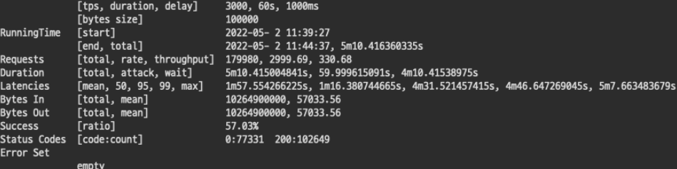 1분 진행한 테스트 조차 실패가 반으로 보이는데 10배는 얼마나 처리하기가 힘들었을까 문제가 생길만하다. 3000TPS는 요청 서버의 스펙만해도 부족한것으로 보인다.