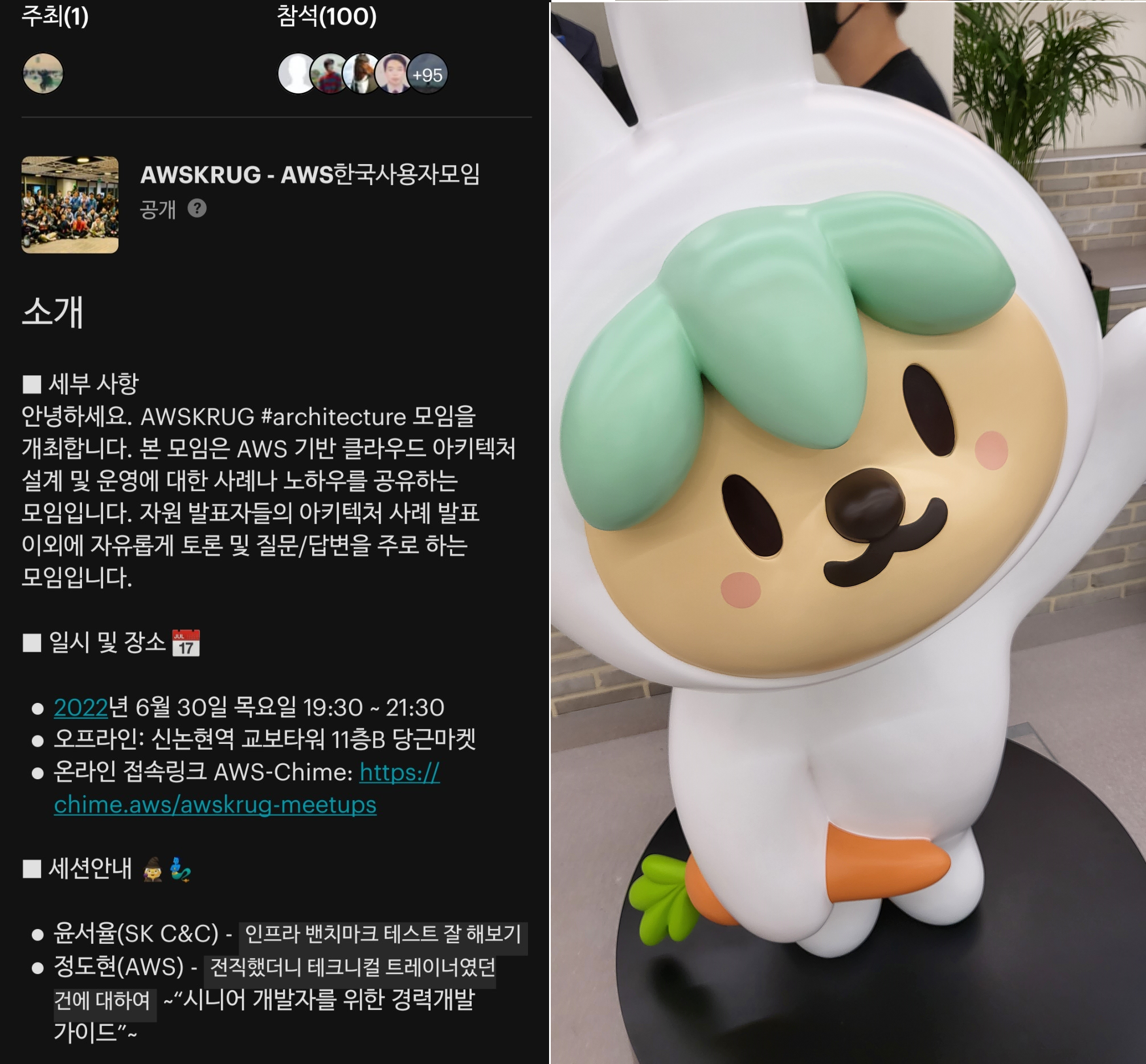 AWSKRUG #architecture 모임의 33번째 소모임에 참석하였다. 참석은 한번이 두번이 되고 두번이 세번이 되었다. 게다가 이번 소모임은 더 특별하게 다가왔다. 한번쯤 학교가 아닌 다른 장소에서 같은 관심사를 가진 사람들 앞에서 발표해보고 싶다는 생각을 가지고 있었는데 처음으로 이룬 순간이었기 때문이다.