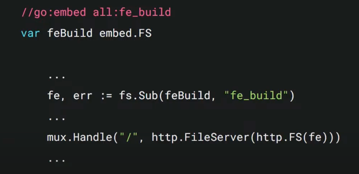 go:embed 예약어를 통해서 fe_build를 명시하면, 현재 디렉토리의 내용을 다 스태틱하게 넣어준다.