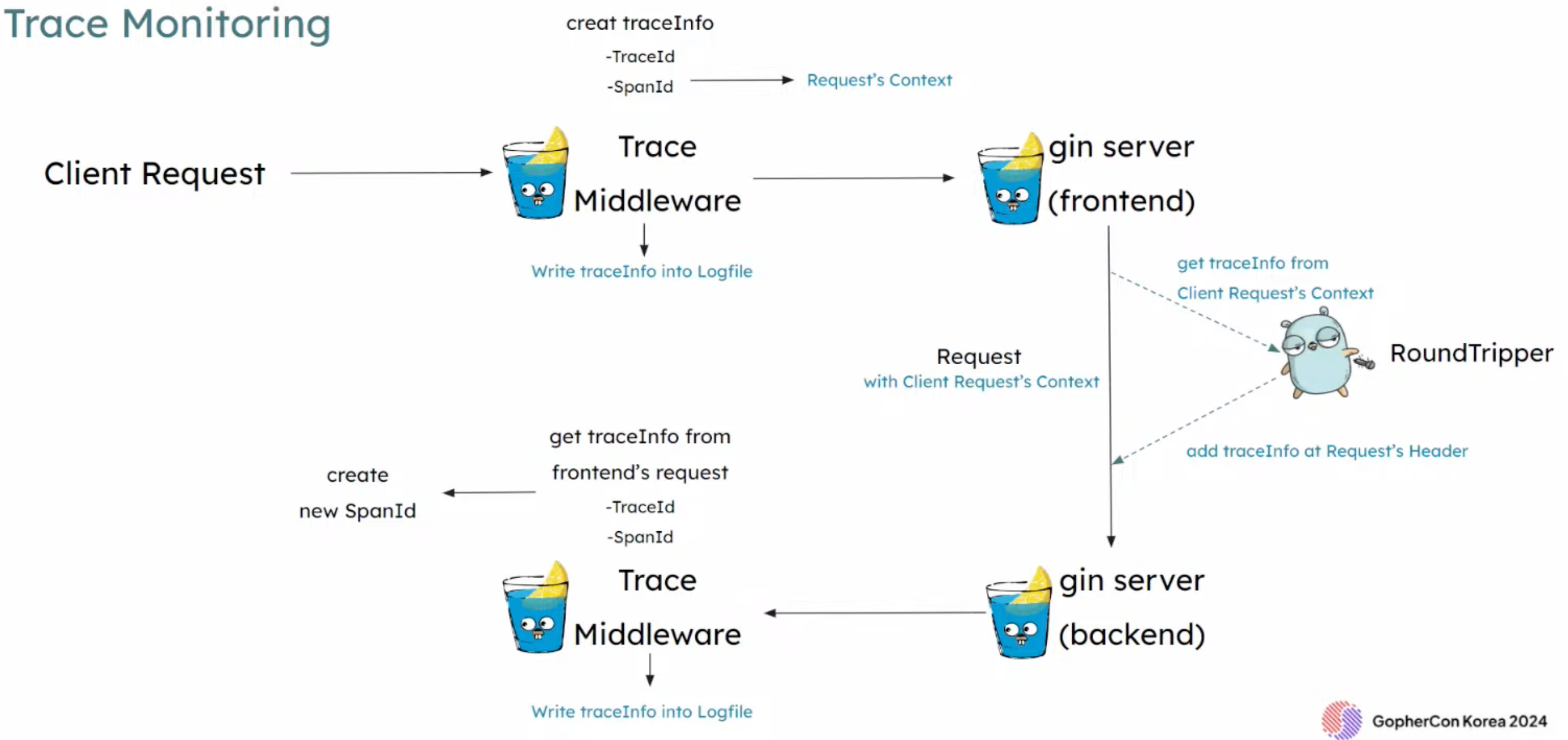 클라이언트가 서버에 요청을 보내면 Trace Middleware는 TraceId, SpanId를 검사한다. 없다면 새로 생성한다. 만약 있다면, SpanId만 새로 생성한다. TraceId를 가지고 앞의 흐름과 뒤의 흐름이 하나의 요청이라는 것을 판단한다.