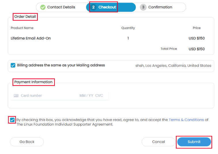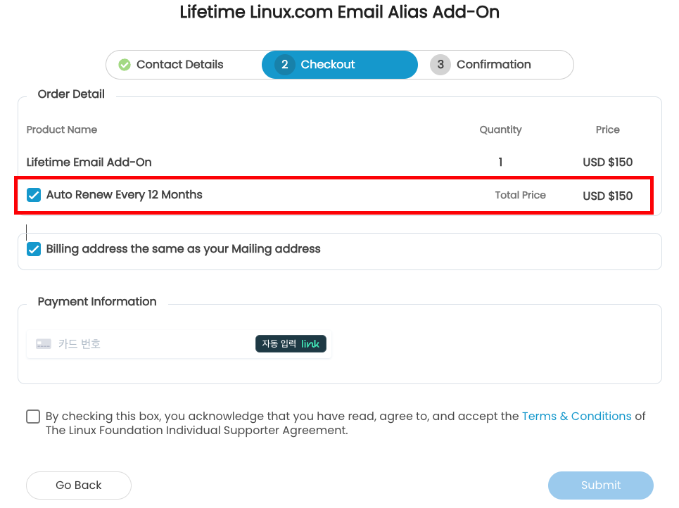 - 활성 Linux 개인 서포터 등록과 함께 평생 Linux.com 이메일 별칭을 구매할 수 있는 옵션입니다.