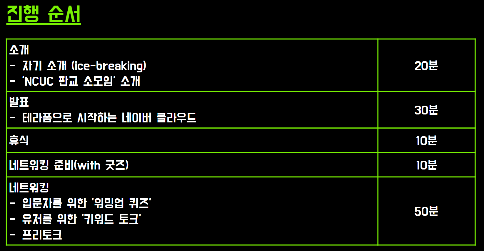1회 지역 소모임이었기 때문에 소모임의 내용은 개괄적으로 잡았다. 이 때문에 [테라폼으로 시작하는 네이버클라우드 플랫폼]이라는 어그로성 제목으로 발표를 하였고, 이후 유저 키워드 토크 또한 소모임의 중점인 네이버 클라우드 플랫폼이 무엇인가? 에 대해서 진행하게 되었다.