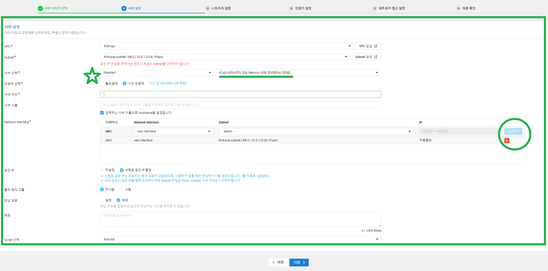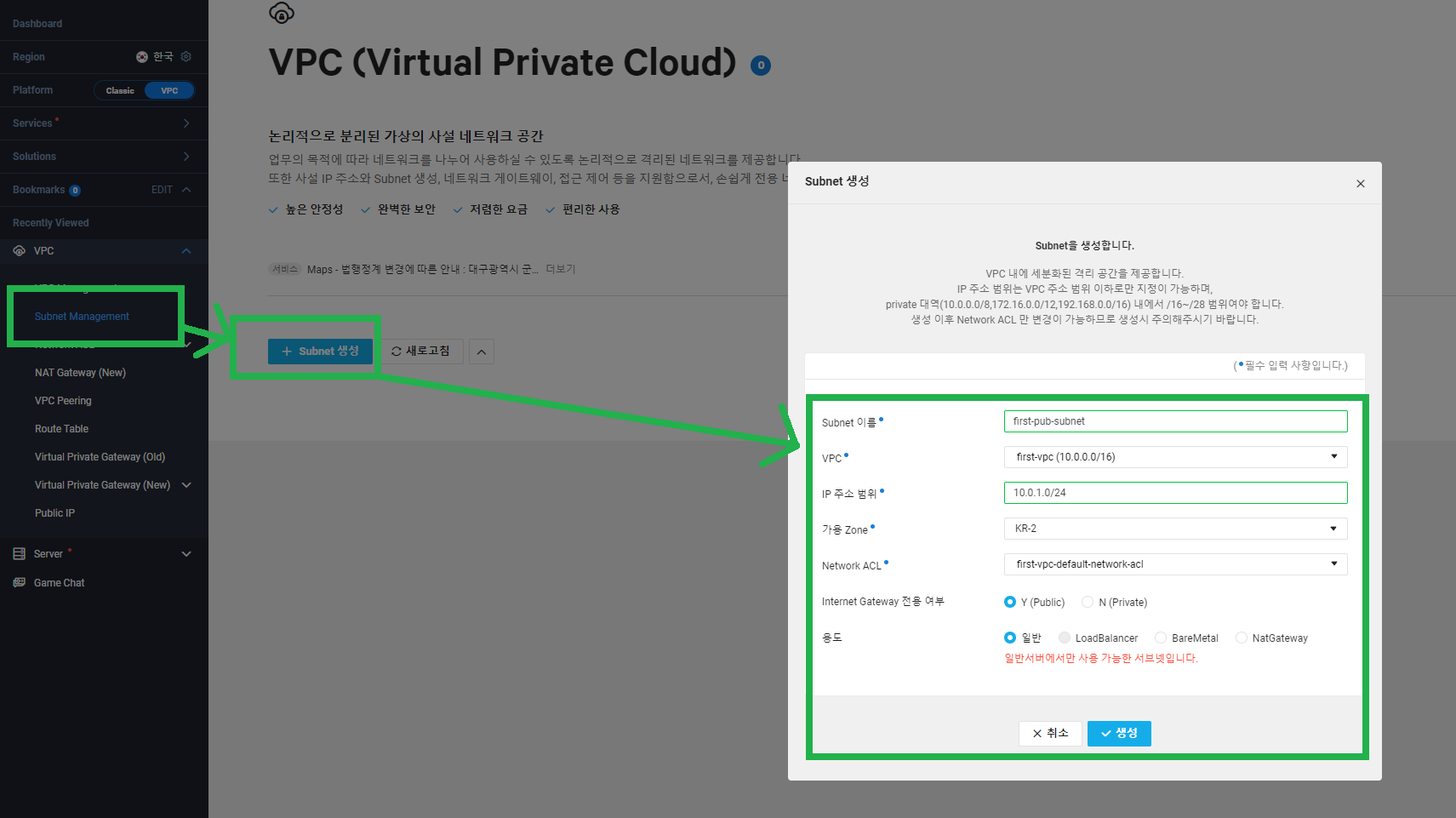 - Subnet: first-pub-subnet|KR-2|10.0.1.0/24|Public 선택
