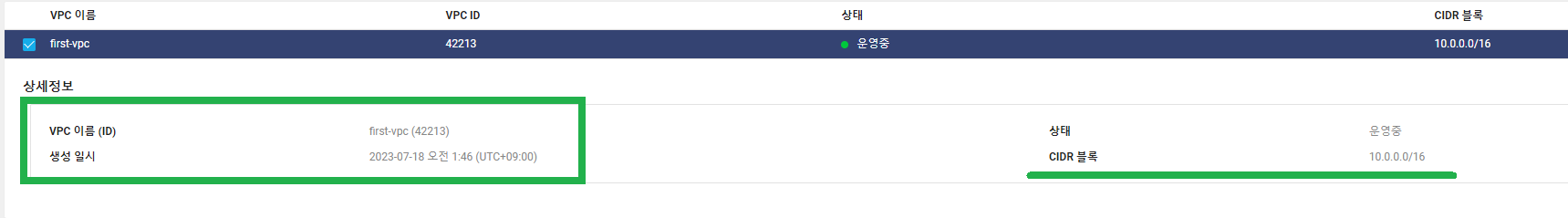 생성되면 다음과 같이 VPC ID와 CIDR 블록 할당을 확인할 수 있다.