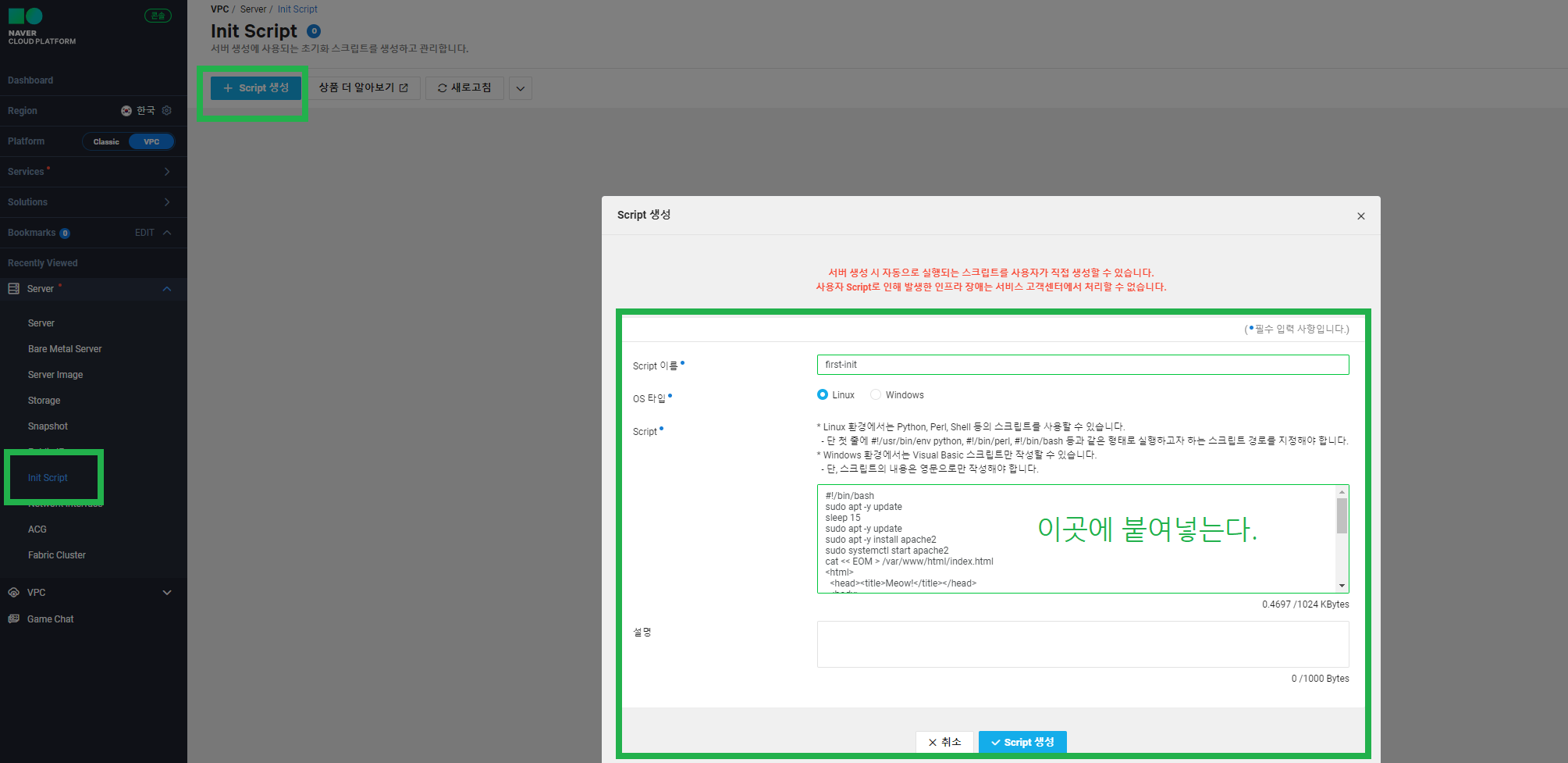 server를 생성할 때 Init Script를 지정해주면 생성마다 반복되는 작업을 미리 정의해두어 재사용할 수 있다. 아래 소스를 Script 항목에 붙여넣는다.
