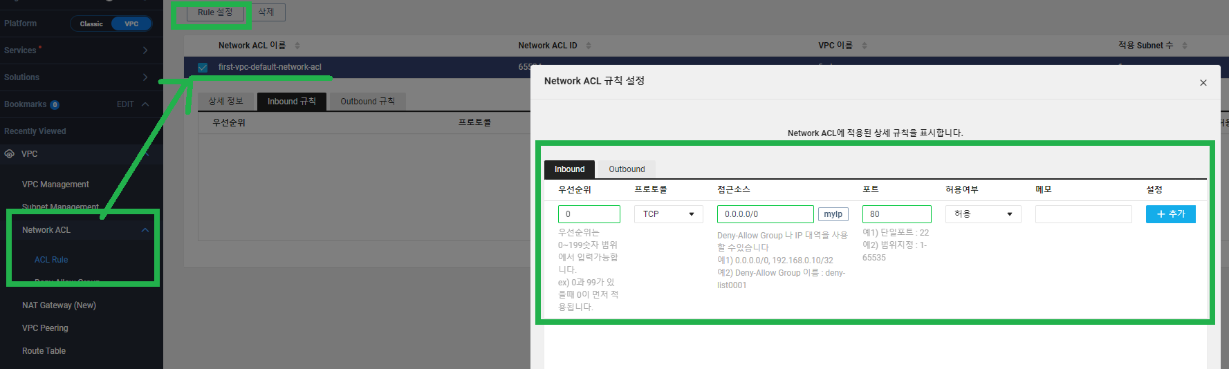 기본으로 생성된 Network ACL에 서버에 접근할 수 있도록 Inboud 규칙과 Outbound 규칙을 설정한다.