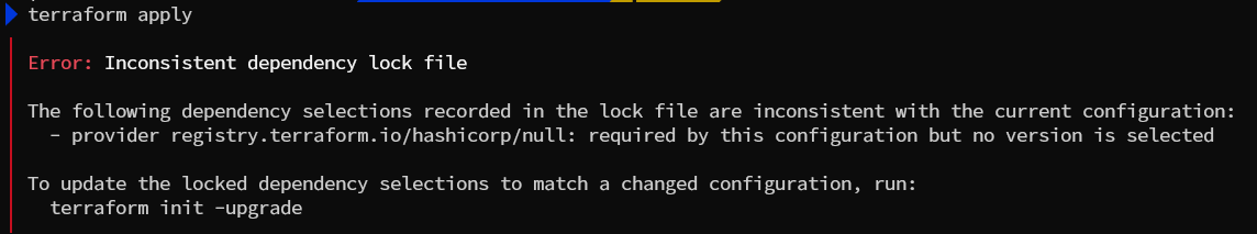 다음으로 main.tf 파일의 모든 주석을 해제하고 실행해본다. 이때, 이전에 이미 수행한 내용이 있어 바로 실행할 경우 의존성 문제로 에러가 나타나며 init을 다시 수행해준다.