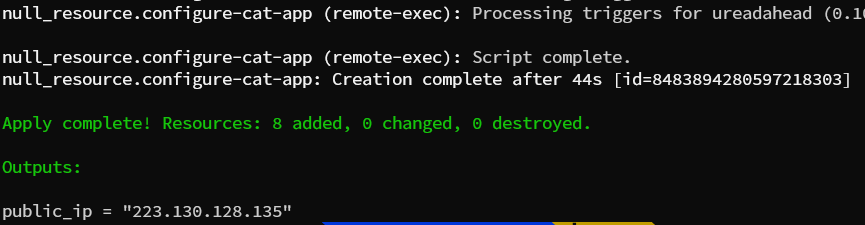 결과로 나타나는 output 내용으로 생성된 server 리소스의 public_ip가 출력된다. 해당 주소로 접속해보면 지난번 콘솔을 통해 진행했던 내용과 같이 고양이 사진과 함께 Meow World 사용자 앱을 볼 수 있다.